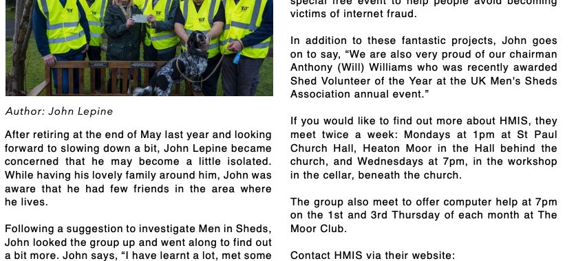 An article written by John Lepine on why he joined Heatons’ Men In Sheds appeared in this month’s local newspaper Full Heatons Post Paper Here
